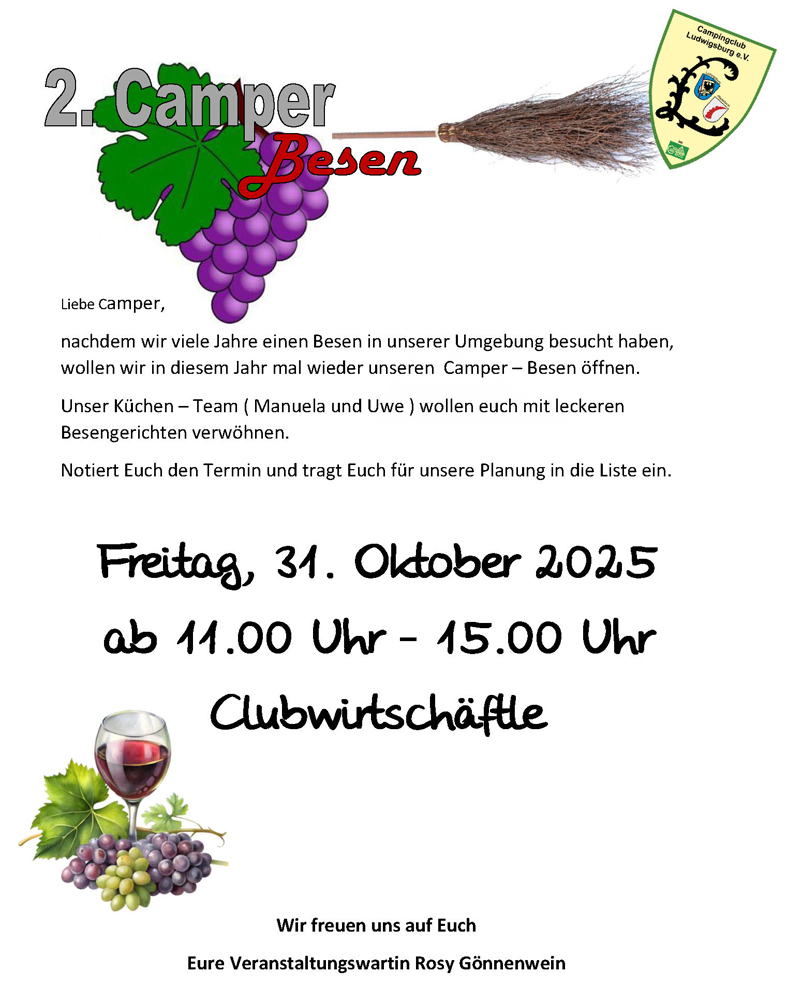 2. Camper Besen Am Freitag, 31.10.2025 zwischen 11-15 Uhr findet unser 2. Camper Besen für unsere Mitglieder statt.